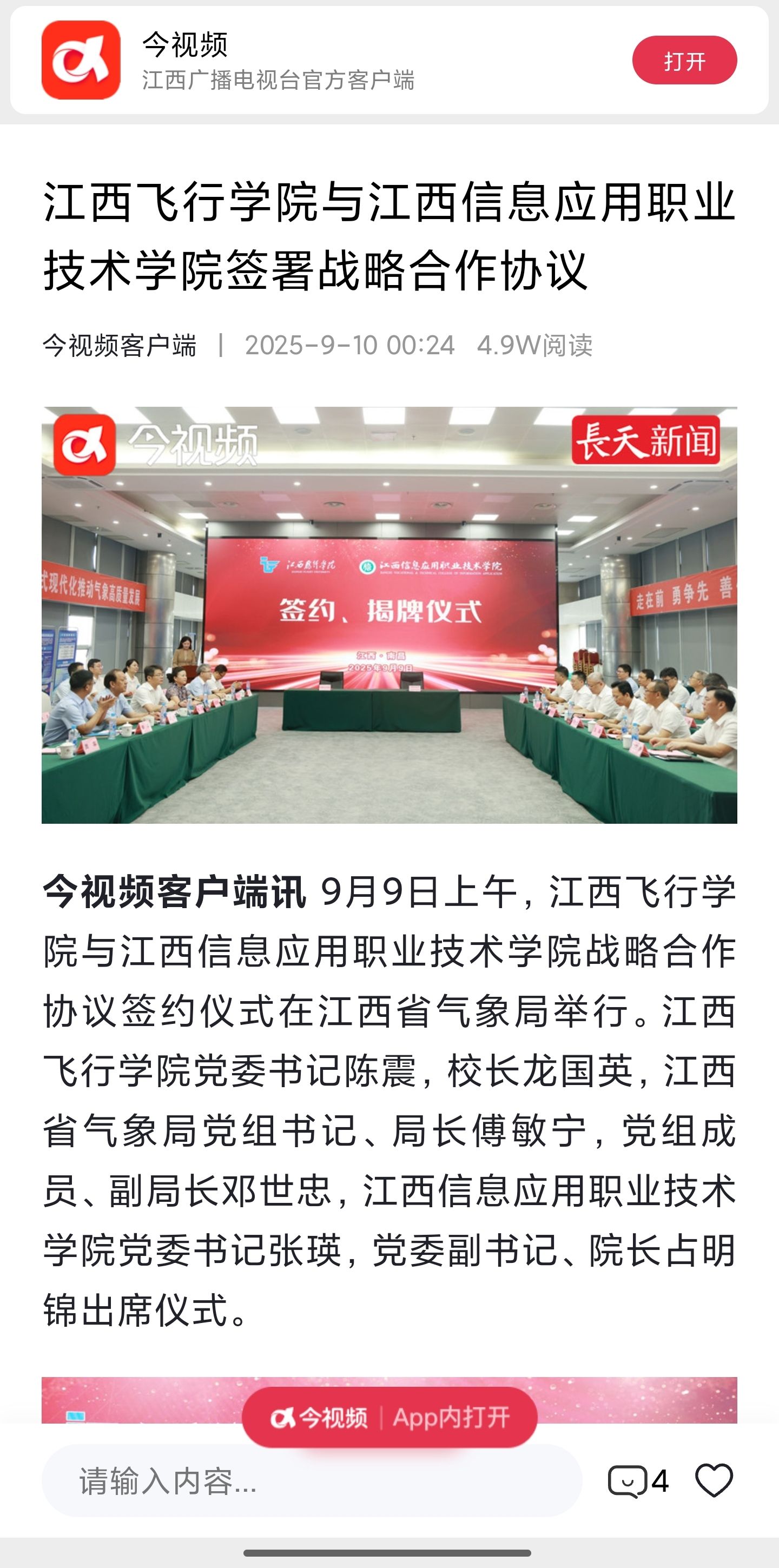 今视频:今视频报道江西飞行学院与江西信息应用职业技术学院签署战略合作协议