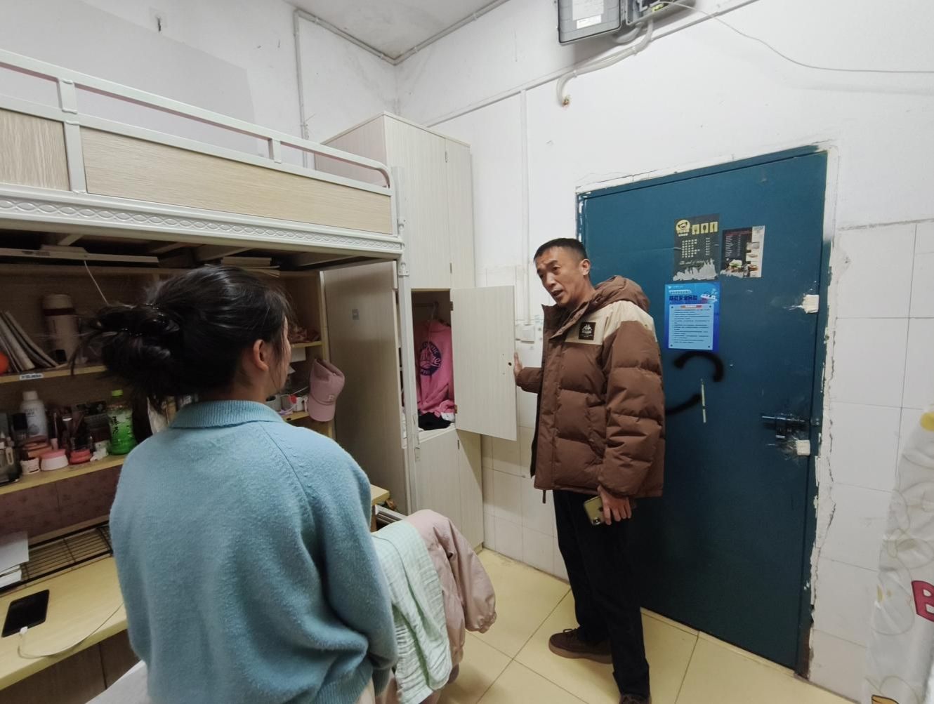 为切实解决学生宿舍储物难的问题,学工处全面排查统计没有立柜的宿舍,根据统计情况进行统一安装,把服务学生的举措落到实处。12月3日,学工处江智萍处长带领相关科室负责人,深入学生宿舍走访查看立柜安装情况。一行人实地查看立柜安装质量、稳固性及空间利用情况,新装立柜排列整齐、安装规范,储物空间充足,有效缓解了学生物品存放难题,并询问学生使用效果,安装了立柜的宿舍同学非常满意。