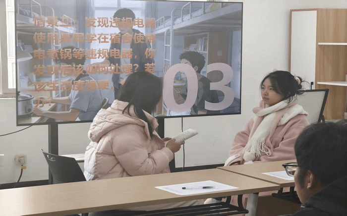 本次大赛紧密围绕寝室长日常工作实际,创新采用情景模拟讨论形式展开。比赛选取“寝室矛盾调解”“突发安全事件处置”等典型场景,能够全面考察参赛选手的应急反应、沟通协调与实际解决问题的能力。寝室长通过结合自身工作经历,在模拟情景中沉着应对、灵活处置,并分享了在自己寝室的文明建设、优秀寝室评选等方面的实践经验。现场互动积极、氛围热烈。