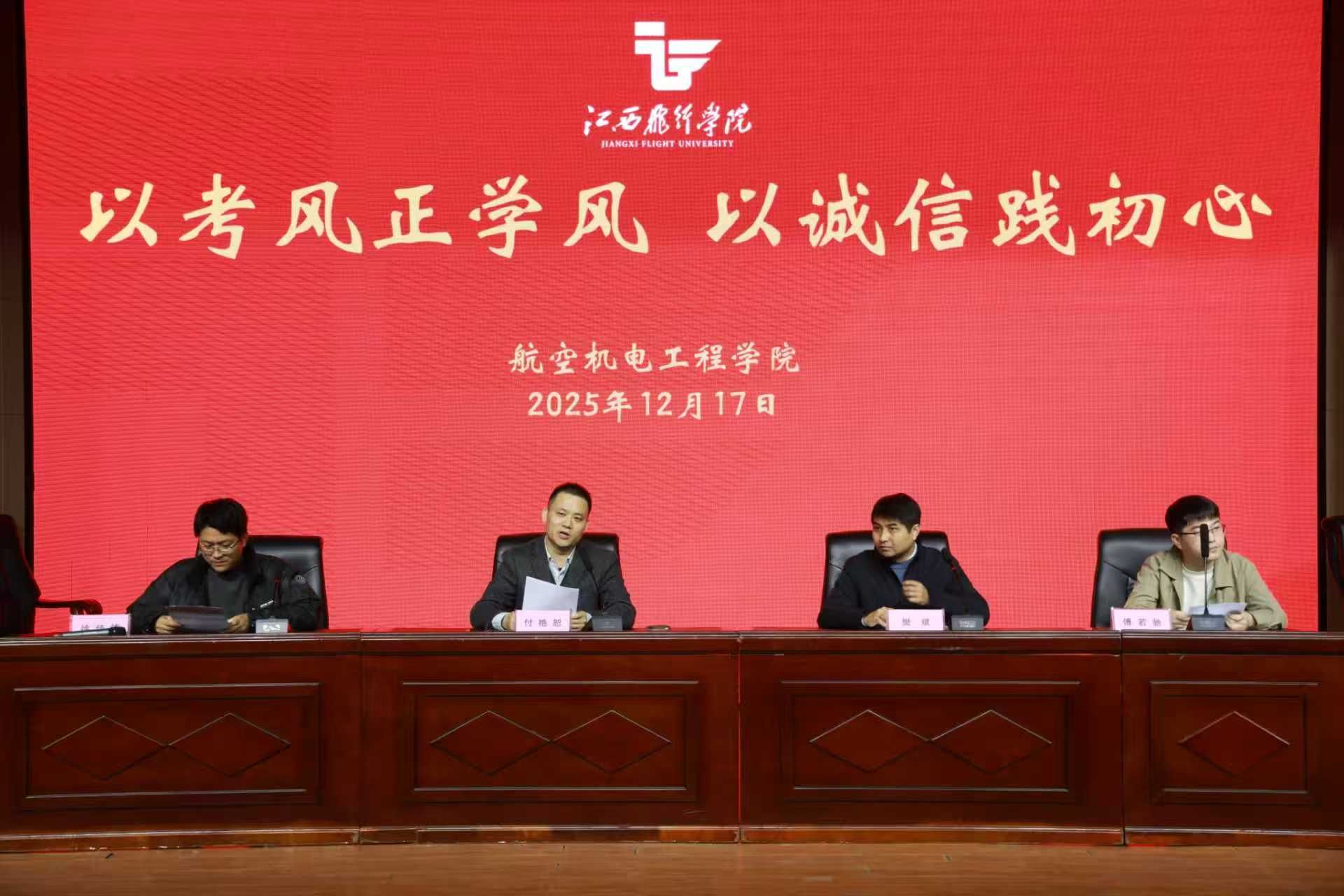 为强化学生纪律意识,营造诚信应考良好氛围,帮助学生理清备考思路、调整身心状态,明确考试规则与违纪后果,营造“以诚信为荣、以舞弊为耻”的优良考风,助力全体学生以扎实学识、端正态度迎接期末考试,2025年12月17日,航空机电工程学院开展“考风正学风、以诚信践初心”主题活动。学院主要党政领导、辅导员、班主任、学业导师,2024级本科班全体学生,2025级全体班委、全体寝室长参加此次活动。
